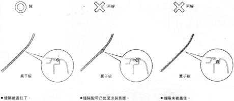 注 意:如果一個(gè)遮蔽區(qū)域使用了密封條,則遮蔽材料必須在密封條剛干以后,趁其還是熱的時(shí)候就要?jiǎng)兂H绻诒蚊芊鈼l的材料在密封條冷了以后才剝除,那么密封條就會(huì)變形,并且難于恢復(fù)至原形。